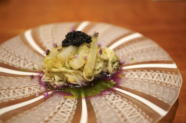 アルデンテに仕上げた富山の大門素麺に、焼き茄子のたたき、アオリイカが乗っています。お皿にも拘りがあり、富山のレース店のお皿を使用しているとのこと。可憐なレース柄のお皿の下面を彩るのは2週間発酵させた茄子から取った紫のソース、そしてパセリの緑のソース。さらに素麺の上にはキャビア、紫蘇が散らしてあります。