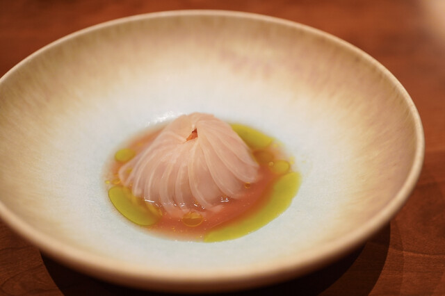 1皿目は20日発酵させたサーモンに薄く切った蕪を添え、トマト、ザクロと青紫蘇のソースをかけたもの。サーモン自体の旨味がパワフルで、そこに酸味のソースが絶妙に絡み合います。