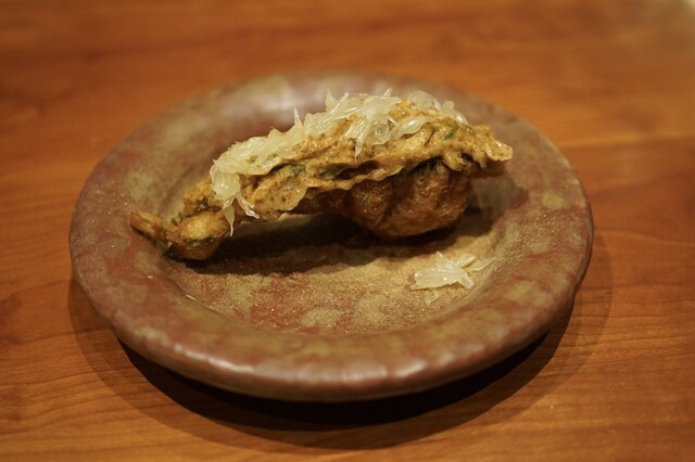 川で採れ立てのものをしめたというイワナを、高温で一気に焼き上げパリパリに。クロワッサンを連想させるような軽やかな衣で、イワナは水分もたっぷり閉じ込められていて身もふわふわでした。