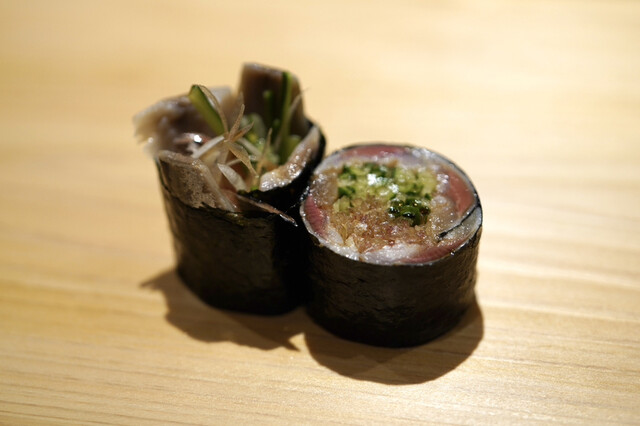 鰯や茗荷、胡瓜を海苔で巻いたもの。鰯は脂が贅沢に乗ってトロッととろける味わいで、そこにさっぱりとした胡瓜や茗荷の辛味がよく合います。