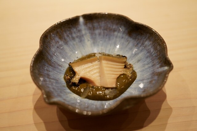 プリップリの弾力と噛んだ後のしなやかな旨みが味わえる鮑自体の素晴らしさはもちろんのこと、肝ソースがずば抜けており、そのクリーミーで濃厚な味わいは唯一無二です。