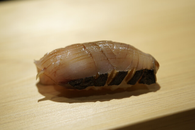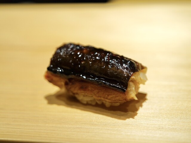 細く切ったものを合わせてシャリに乗せてあります。とってもねっとりとした食感で、濃厚な味わいが楽しめました。