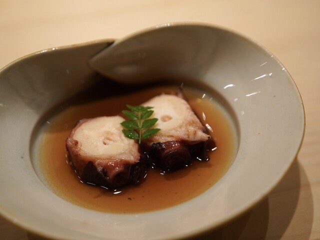 足と頭。足はほうじ茶で6時間煮たもの。頭は短時間で蒸したもの。同じ蛸ながら食感が違っていて面白く、どちらも出汁が染みていて美味しいです。