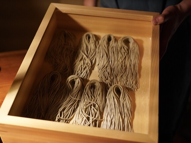 鈴木シェフが朝粉を挽き、数十分前に打ち立てだという自家製の二八蕎麦。合わせるのはブロッコリーのソース。そして具材は贅沢なフグに海苔、キャビア。