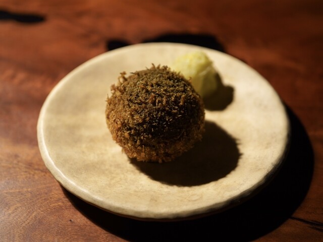 じっくり揚げた里芋に、白カビで熟成した峯村牛の生ハムを合わせた一品。水分が程よく抜けた里芋は、サクサクでフワフワな食感。里芋の優しい味わいに峯村牛の濃厚な旨みが加わり、ハーモニーが素晴らしい逸品です。