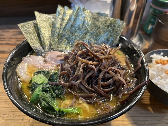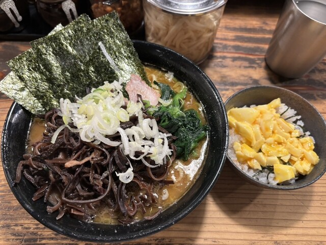 席は満席で待ちは2人、券売機でラーメンかため、キクラゲ、半玉子まぶしを注文して、階段に並びます。