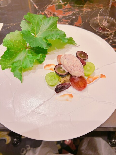 【♀️大粒の3種類のブドウにアイスクリームとスポンジ生地のデザート。めちゃ美味しい】