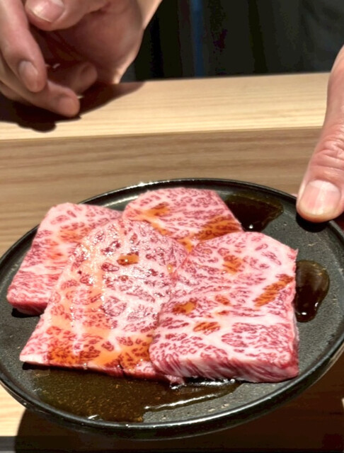 見た目も綺麗。赤身は驚くほど柔らかく、脂の主張は控えめ。肉そのものの旨みが濃いの、ランプは程よい脂は甘味があり、全く重くない。村沢牛の魅力が堪能できて心も、お腹も満たされる♩
