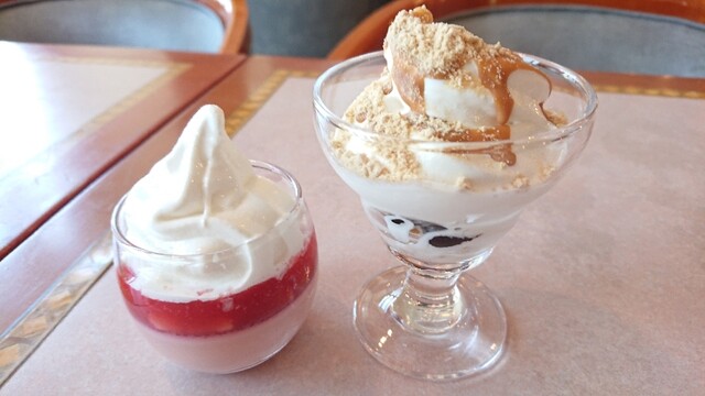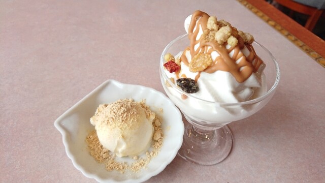 バニラアイスにきなこトッピング、ソフトクリームは底にコーンフレーク、キャラメルソース(固まるやつ)にフルグラトッピング