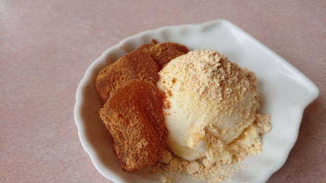 きなこバニラにさっき取ってきたわらび餅を添えて