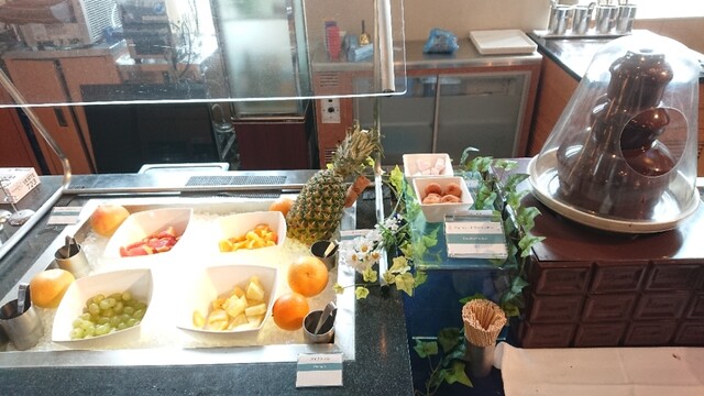 チョコファウンテン(ミニドーナツ、ハート型マシュマロ)、フルーツ4種類(オレンジ、パイナップル、グレープフルーツ、ぶとう)