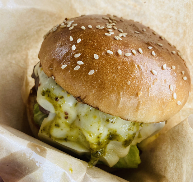 チーズバーガー専門店でポテト・ドリンク付きのセットのみとなっております。1,600円税抜きであります。チーズは6種類あり、娘がおそらく1番人気であろう「チェダー」を選択しましたので自分はバジル好きということもあり「モッツァレラ(バジルソース入)」をチョイス!ドリンクは娘「ウーロン茶」私め「ジンジャーエール」を選択、やはりバーガーには炭酸ですよね笑笑
