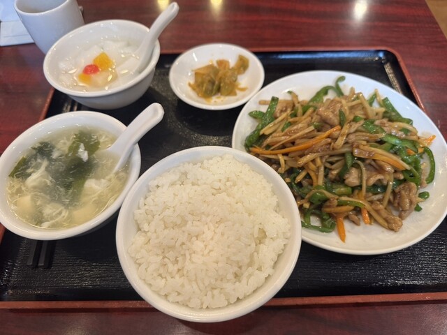 餃子を軽く…と思って入店したものの、土日にも関わらずランチメニューがあったためせっかくならとがっつり青椒肉絲定食をいただきました。