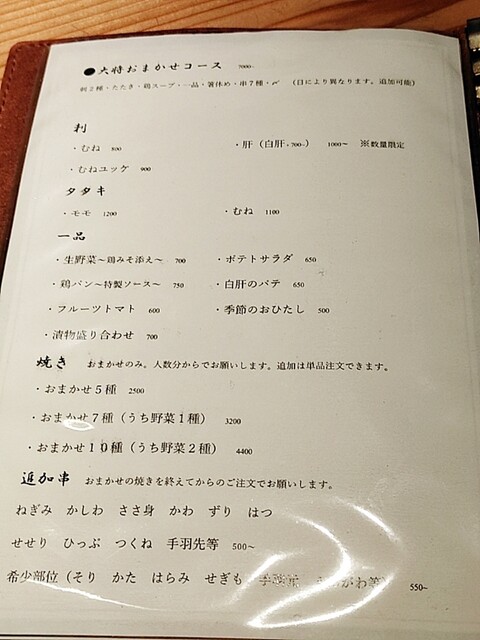 ●おまかせ7種・・・つくね かた かしわ(もも) ねぎみ 茄子(たれ) ささみ(梅肉) 手羽先
