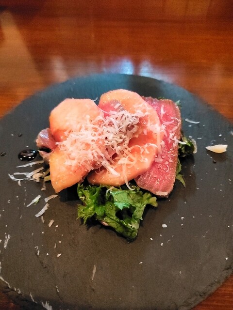 焼きなすの香ばしさとほのかな甘味のピューレが鰹と調和し、シャキシャキ野菜の食感もいい感じ。