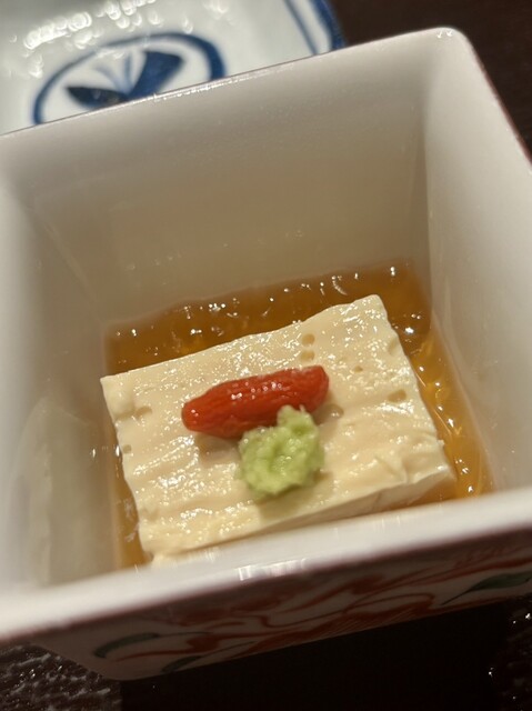 鯛は海苔の佃煮が入っている煎り酒で頂きます。佃煮の甘味と煎り酒の酸味で頂くお刺身は初めての味わいで美味しいです。