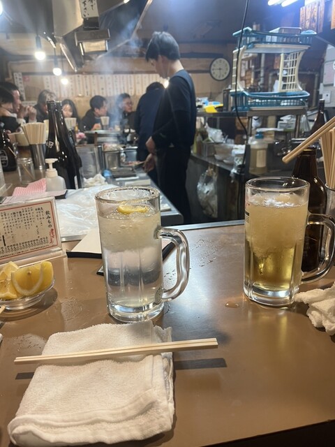 昔はあったねーってくらいに、斜に構えて座るカウンター。通常の人数以上座ってるであろう。出てきた酒も濃い!レモンサワーは口に塩がついとる…