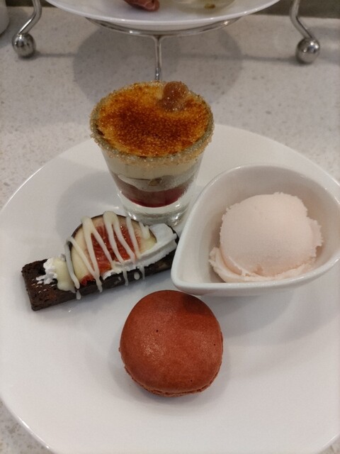 ナッツのブリュレ 桃のシャーベット マカロン 無花果のブラウニー