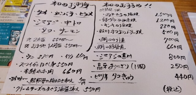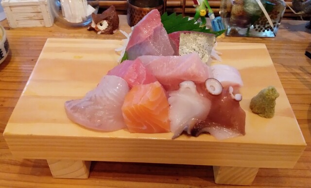 本日のお刺身が一人前でも頼めるとあったのですワクワク頼んだのですが、厚めのお刺身の宝箱でした。