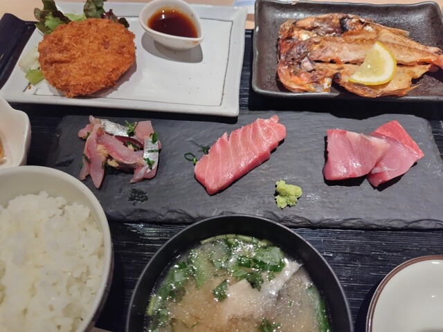 この日のメニューは「板盛り・金目のひらき・あみままメンチ・小鉢・ごはん・味噌汁」。