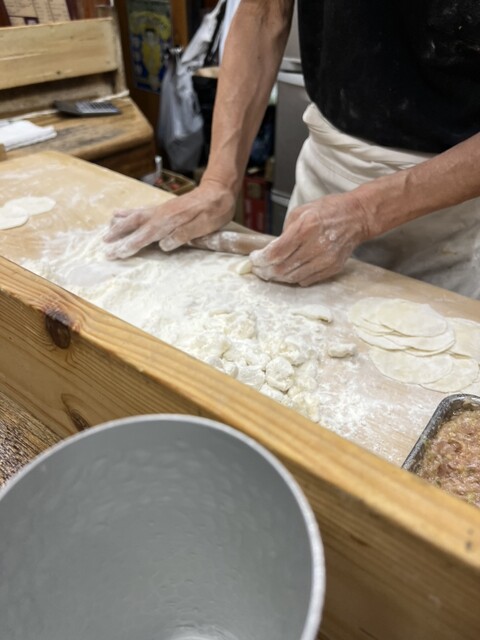餡は、あじが薄味で、専用のぎょうざタレか白髪ネギと肉味噌ののせの両方の味を試せます。自分はネギ肉味噌のせの方がすきでした。餡には五香粉と言う食材が使われており