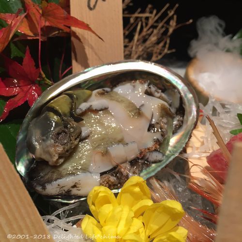豪華8点盛りのお刺身は、ハマチ、かつお、あわび、本まぐろ、さんま、鯛、ぼたん海老、うに。