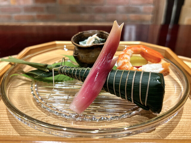 ◆ 厚岸の北海シマエビ 枝豆 チップの棒鮨 玉蜀黍揚げたやつ サツマ芋のレモン煮 唐墨 トマトとアスパラの胡麻酢掛け