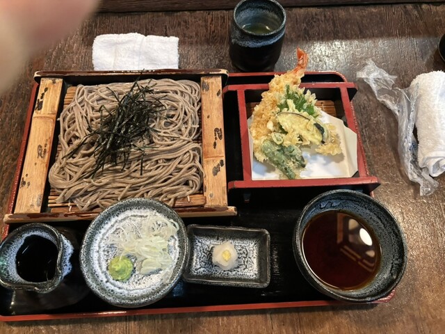 登山帰りに寄りました。塩分を欲していたのでより美味しく感じました。天ざるか鴨のつけそばを注文されている方が多かったので天ざるに。お蕎麦は白か黒を選べますが迷わず黒。少し幅広のお蕎麦で硬めに茹で上がっていました。その加減がよく、量も多め。よく、あと少しあればと思うことが多いのですが、大満足。蕎麦湯も大変美味しく頂戴しました。そして、いただいたお茶がさすが静岡と思うくらい甘みのあるお茶でした。ごちそうさまでした。