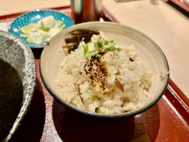 鮎の土鍋ご飯。おこげしっかり入ってるロットやった!そのままでも美味しいし、最後は出汁をかけて食べる茶漬け風にしちゃうよねー。ご飯であったかくなった出汁はまた印象が変わって…美味しいなあ…。