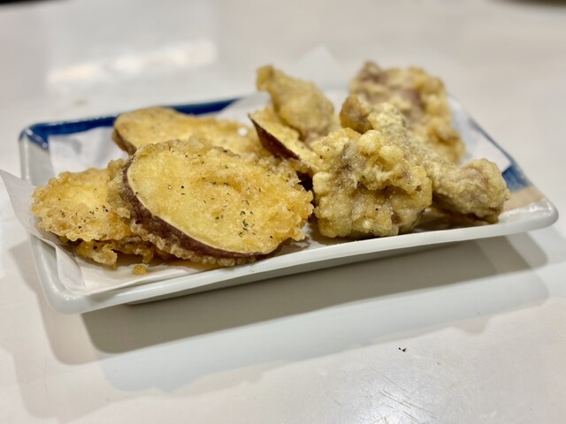 トッピングは鶏天。一昨年くらいから登場してたんやったかな?外はサクサク中はジューシーしっとりでめっちゃ美味いんよ。酒不可避系のたまらんやつ。で、こちらではデフォでついてくるかき揚げ。これもたまらん。お腹に余裕があればいつか米と一緒にかき揚げ丼にしたいやつ!