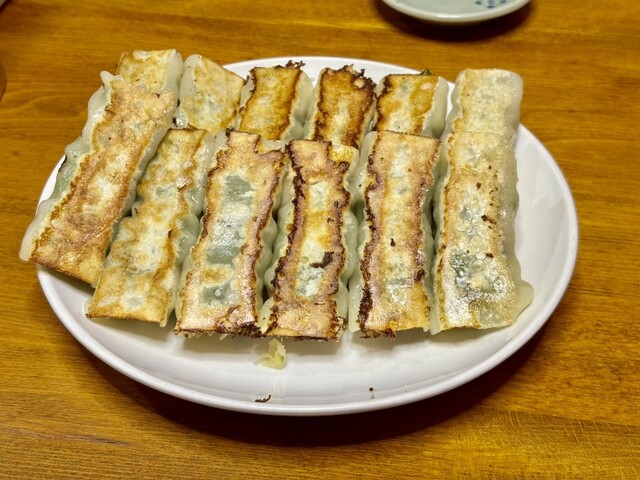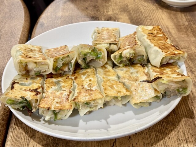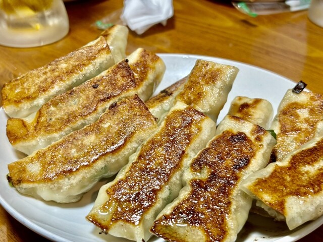 とり皮と同時にビール着、程なくしてギョーザも到着。皮はこの半分くらいでちょいつまむくらいのノリで頼んだんだが、しっかり量あるぜ!酸味と辛味の効いたタレがよき。ギョーザはエビが苦手なんでいつもしそ。そのままでもしっかり美味しいし一つ一つが大きくてジューシー。ギョーザ食べてると予約制のシューマイも気になった。とろける唐揚げやチャーシューネギ巻きも好きやけど、一人で来るならギョーザがちょうどいい量。ビールのお供何食べても美味しいお店なんで、一人で来るのは少し損した気分。