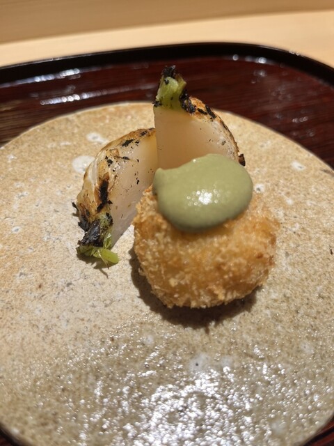 こだわりの食材、旬の食材をこだわりの食器とともに楽しめるおまかせコース。正直、どの料理もこだわりを感じられて印象的だが、その中でもお気に入りは松葉蟹とカリフラワーのクリームコロッケと焼きカブ。カリフラワーをクリーム状にして作ったカニクリームコロッケはカニの味もしっかり楽しめたし、カニ味噌のソースはそれだけでお酒が進みそうな味でした。一緒に添えられた焼きカブは、お造りのときにも出てきたイチローファーム産のもので、生だとシャキシャキの食感と甘さを感じられたものが、焼くとさらに甘さを感じるとともに、とてもジューシーで脇役には収まらない存在感でした。