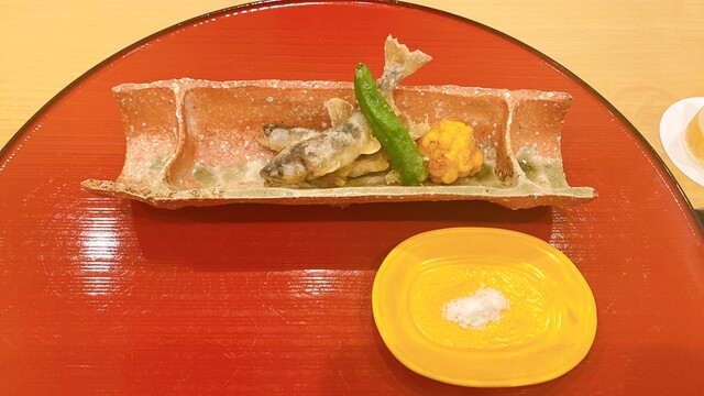生紅葉に下に屋形船風の八寸、どうもろこしのすりながしが、濃厚、とうもろこしの自然の甘みがなんとも美味しい。カナッペや毛蟹、野菜のゼリー寄せやはも、柿の葉寿司など楽しませてくれました。