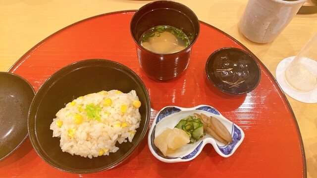 温かい器に乗せられた太刀魚、生麩、また、鮎の天ぷら、ナスの揚げ出し、コーンご飯、香の物、