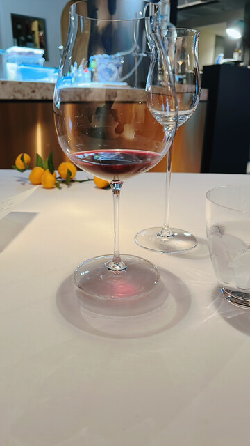ワイングラスに注がれたお料理に合う凝った飲み物、玄米茶ベースにネパールの山椒やシナモン、抹茶が入った飲み物、お茶の苦味とハーブの香りとお料理が丁度良い。