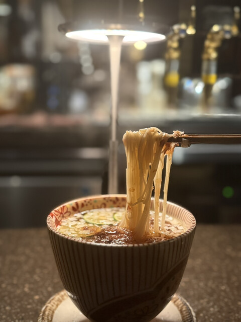 締めの「鰹と鶏出汁入麺」は、やさしい出汁が体に染み渡る癒しの一杯