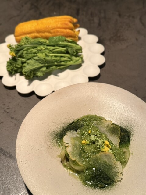 野菜の端材や皮を使ったパン、発酵を忍ばせた紅くるり大根、金時人参のラザニア、サムライオイスターの塩味を効かせた菜花。