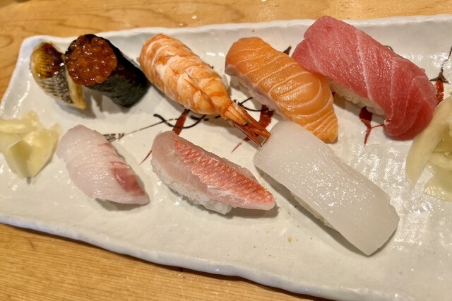 おまかせ(左上から右下へ、イカ、数の子、赤貝、いわし、エビ、玉子)