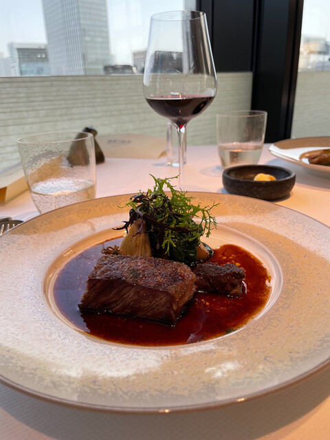ジビエ系が苦手なのでメインは直球の牛肉を選択しました。ほんの少し脂を感じますが、筋肉質なモモの部分が赤く色焼けていて美味しい。付け合わせの茸の食感も素晴らしい歯ごたえで食べ終わるのが悲しかった(涙)