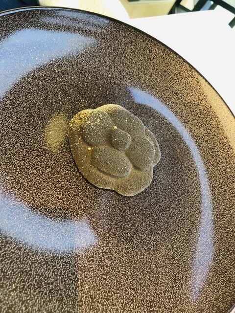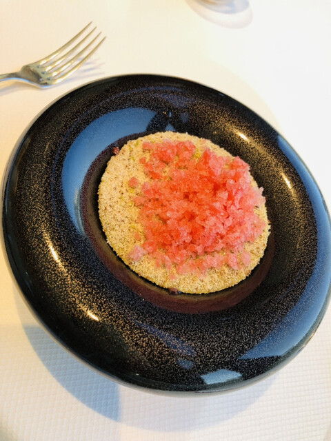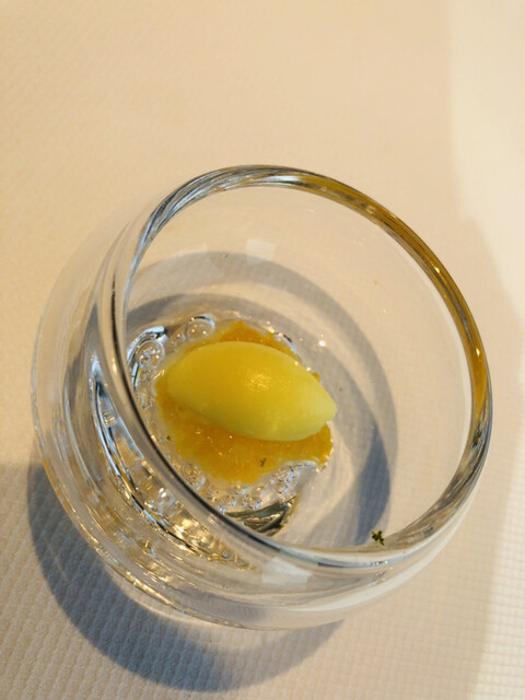 3.ブラッドオレンジの上にアーモンドミルクをエスプーマ状にした冷たいスープが出てきたのですがこれはお口直し?と錯覚するくらいさっぱりしていて美味しい。柑橘類の登場回数が多いのは女子受けする構成ですね。
