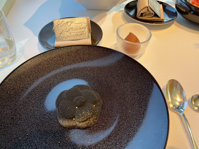 旬のイチゴはシェーブ状になって、下のフロマージュブランを崩して食べるもの。デザートはもう少し大きいと良かったかな。 その代わりに旦那様のカメリアチョコとチョコレートアイスを大部分食べました(笑)流石のアランデュカス、カカオの含有率高く、酸味を感じる大人味のチョコレートアイスです。