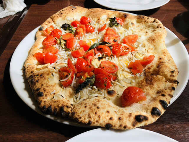 最初にやってきたのは、シラスのピザのチチニエッリ。トマトソースなしのビアンカタイプです。フレシュトマト、ニンニク、シラス、オレガノとシンプルな材料なのに、生地がカリッと香ばしく、耳の部分コルニチョーネもペロリと食べちゃいます。この生地感はなかなかないです!