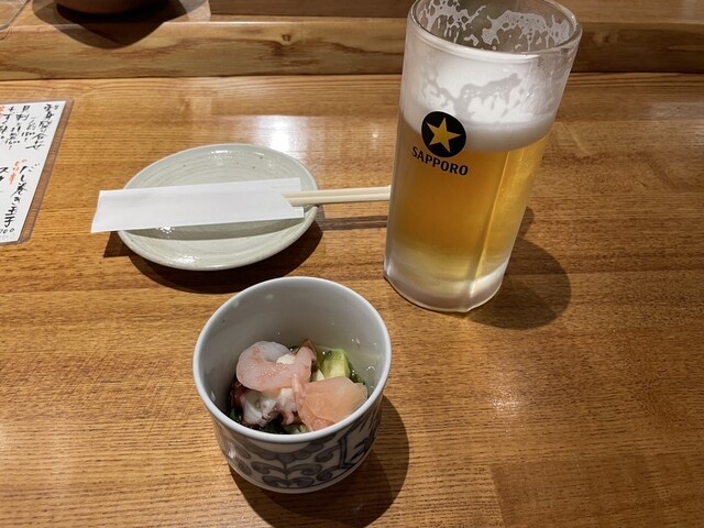 お通しは、魚介の酢の物と言ったら良いかな。タコ、イカ、ガリ、夏野菜、もずくが入っているのですが夏らしくもあり、またスターターとしてもピッタリで、飲み物の如く瞬殺してしまいましたw(相棒は、海老とタコに悶絶してましたw)