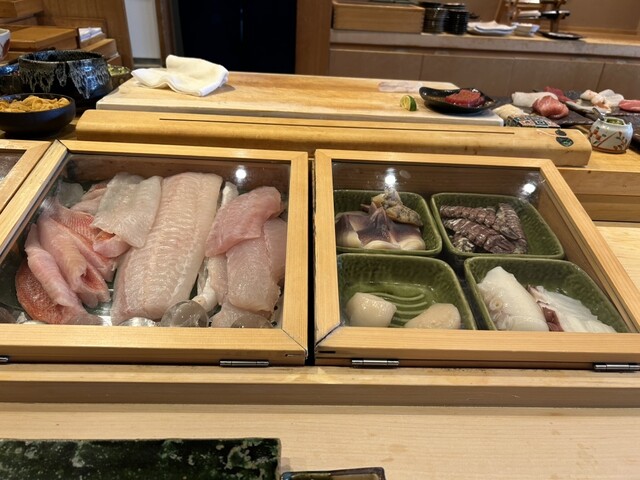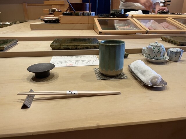 お店に入ると綺麗な木目のカウンターが目を見張ります。そして大将たちが洋風のコックコート風の調理服を着ていらっしゃったのが印象的です。食器や設えなど和風ですがなかなかスタイリッシュなお鮨屋さんですね。