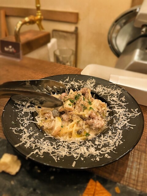 店員さんに相談しながら自分好みのパスタが食べられるのは新鮮な体験!今回はお肉系のクリームパスタにキノコを追加してみた。他の組み合わせもぜひ試したい!