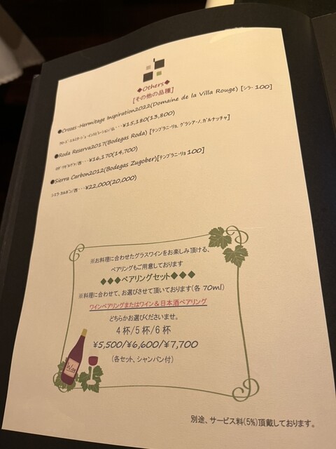 ペアリング 日本酒込みとワインのみを選択でき、わたしは日本酒込み。母はワインのみ