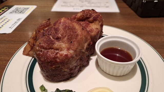 塊肉を喰らう、周りは香ばしく、中はジューシーなポークステーキは大満足な一品です♪( ☆∀☆)d