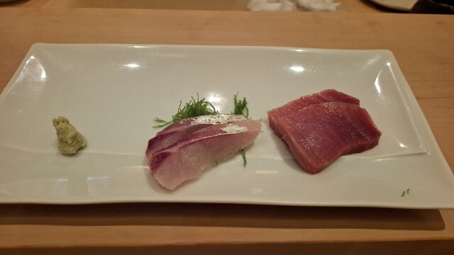 カンパチの鮮度の良さを示す身の張り、そして甘みがとても良い、塩釜産本鮪の持つ濃厚な旨味は噛むごとに味わえて最高です♫
