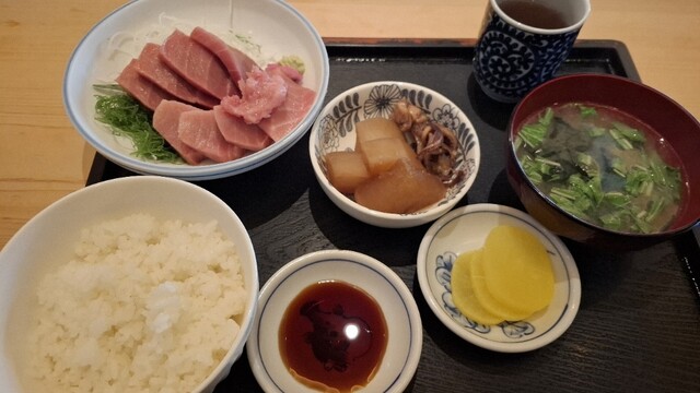 本鮪、煮物、お新香、ご飯、味噌汁のセットです