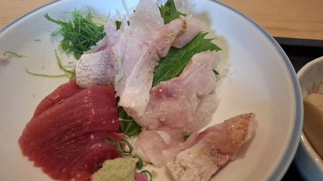 刺身の中トロは腹4、背3の7切れが乗っており、定食は刺身にご飯、小鉢、漬物、味噌汁が付きます